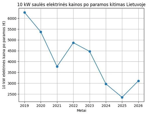 10 kW saulės elektrinės kaina (sausio mėn.) ir parama skirtingais metais: